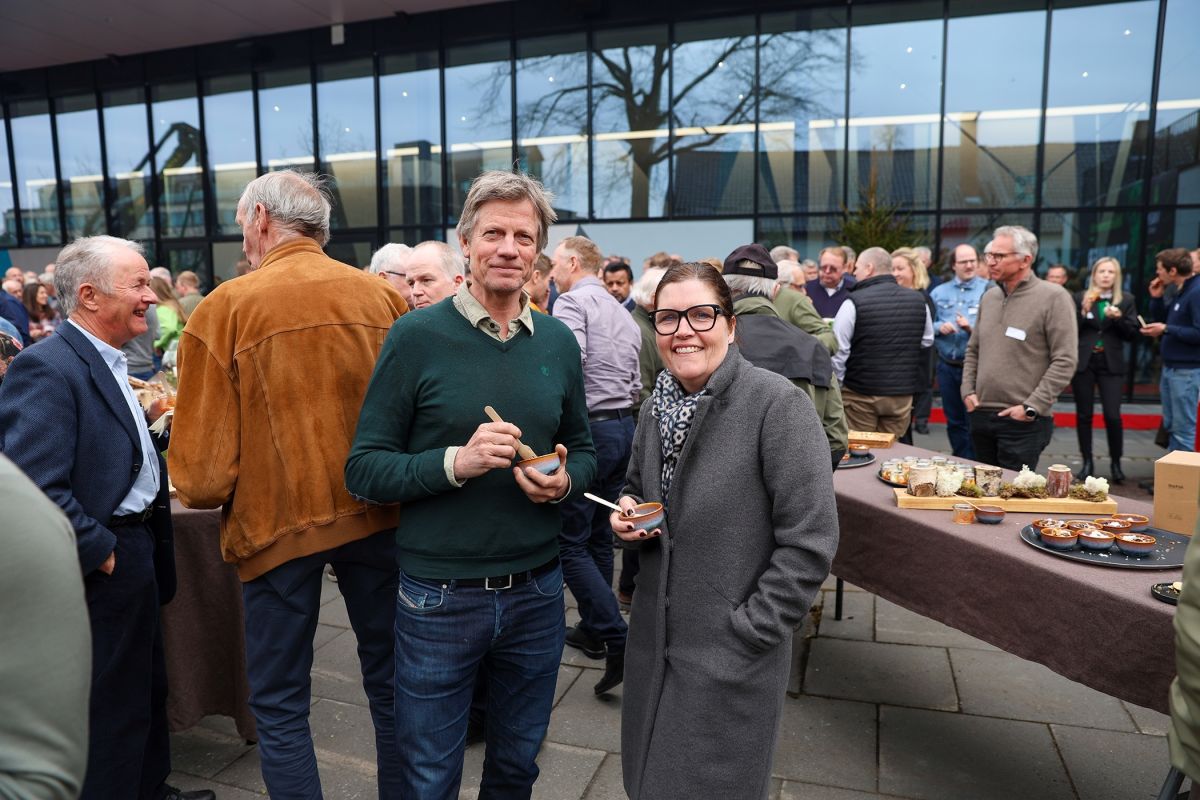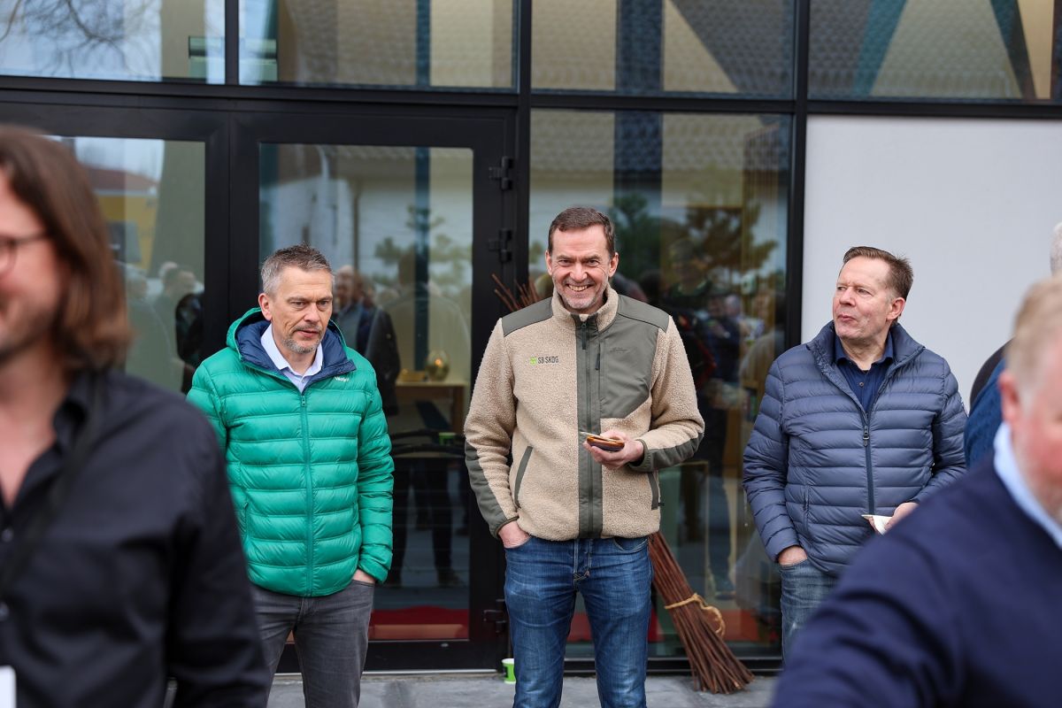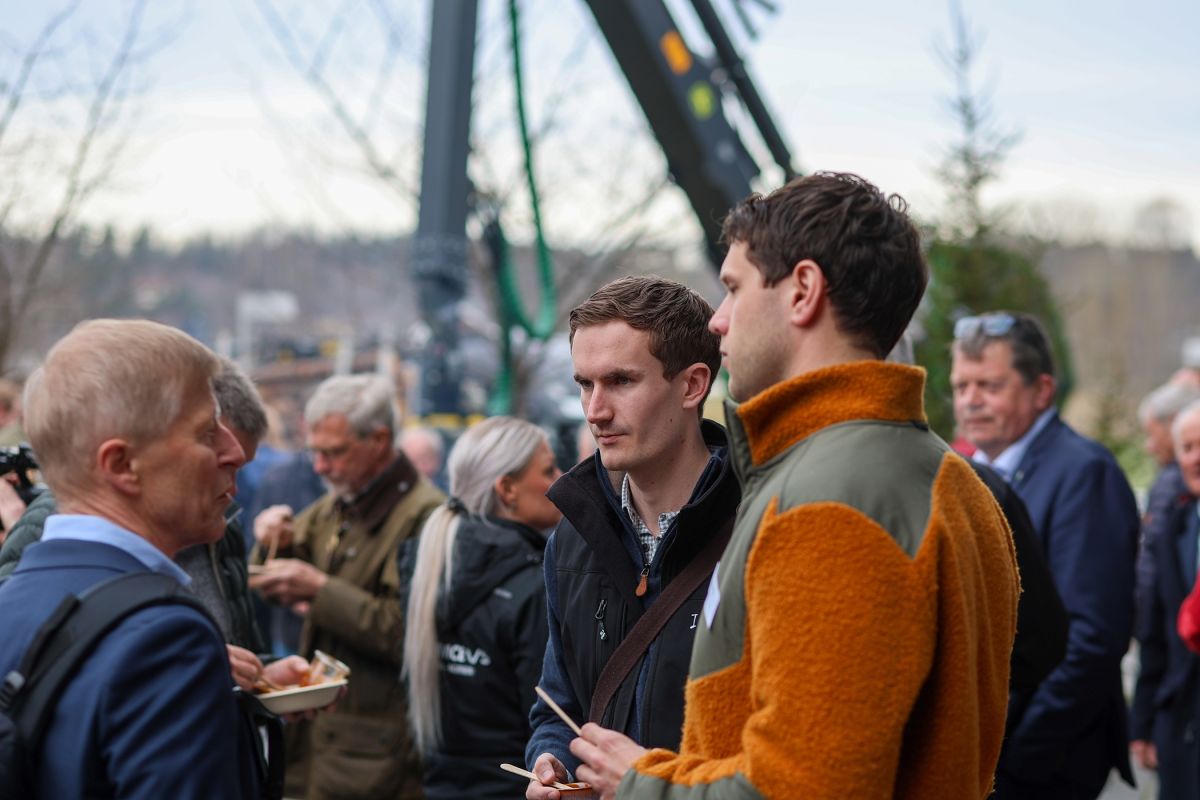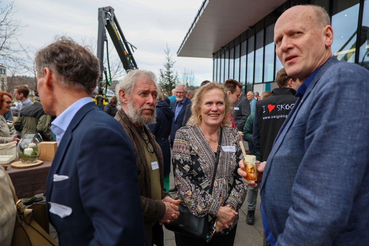 MINGLING: Nils Bjørn Vistad, skogeier i Ringerike, Ellen Alfsen, direktør for kommunikasjon og samfunnskontakt i Skogeierforbundet, og Anders B. Werp, nyvalgt medlem i Viken Skogs styre, i hyggelig prat utenfor Sundvolden Hall.