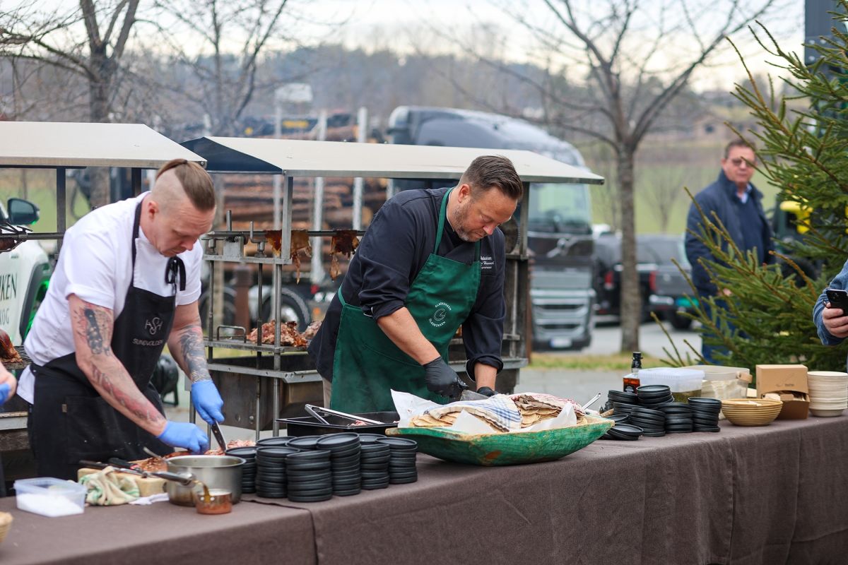 GOD FROKOST: Helstekt gris, skjært opp og lagt i lomper, var hovedmåltidet på tømmerfrokosten.