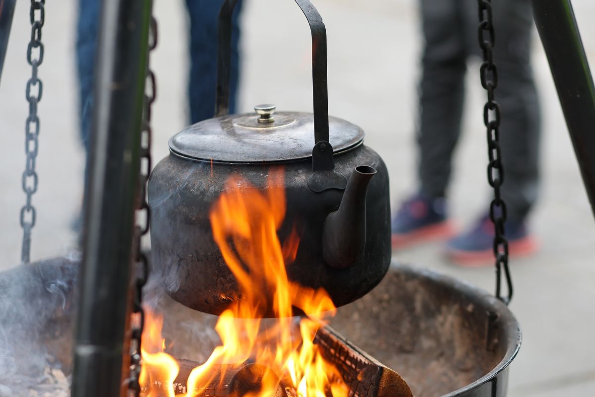 BÅLRØYK OG BÅLKAFFE: En kaffekjele som henger over et vedbål, hører naturlig til en tømmerfrokost. Lærere og elever ved VG2 skogbruk på Saggrenda sto for kaffekokingen.