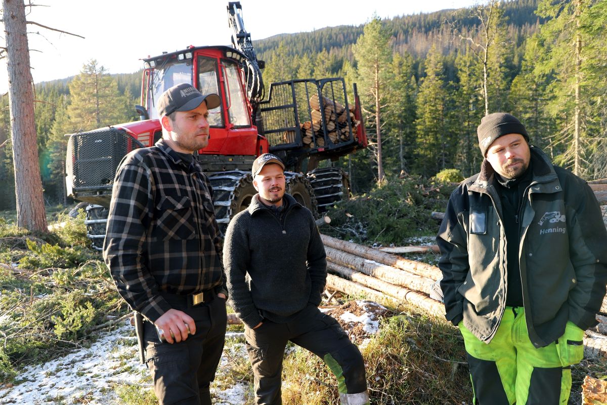 HOGGER PÅ: Knut Sigurd Brekke, Niri Svingen og Henning Egedahl i Numedal Skogsdrift, her i forbindelse med en drift der mye tørkeskadet skog er tatt ut.