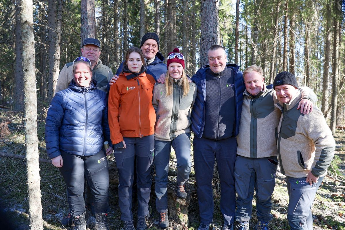 FRA VIKEN SKOG: De seks ansatte i Viken Skog som tar skogteknikerutdanningen, her sammen med skogsjef Lars Kristen Haug og HR-sjef Inge Myrlund. Fra venstre: Julie, Lars, Viil, Bjørn Kristian, Mari, Inge, Knut Erik og Vegard.