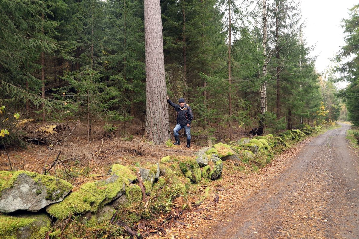 SKAL FÅ STÅ: Alf Harald har mange trær på eiendommen som aldri skal hogges, som denne digre furuen.