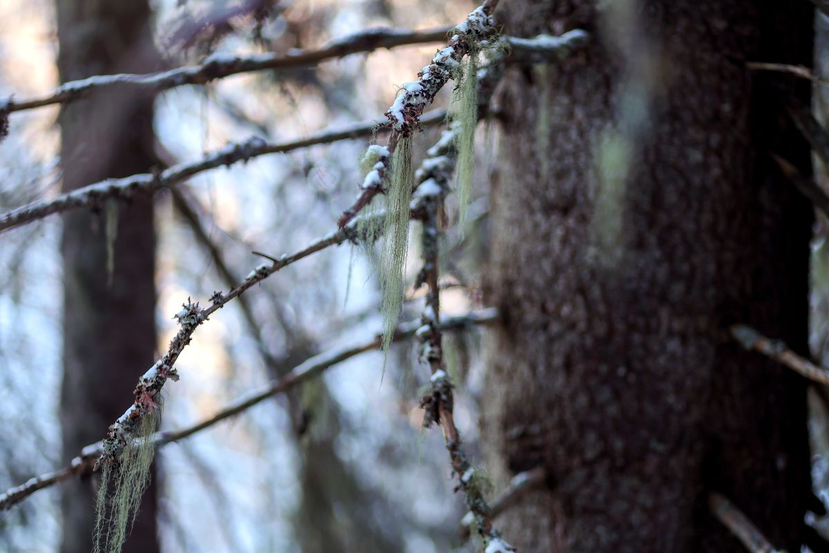 GROVE GRANER: Mange av trærne i skogen er både store og gamle. Nå om vinteren er det ikke så mye å se av de ulike artene som trives i skogen. På dette bildet ser vi hengestry på kvistene til en grov gran.