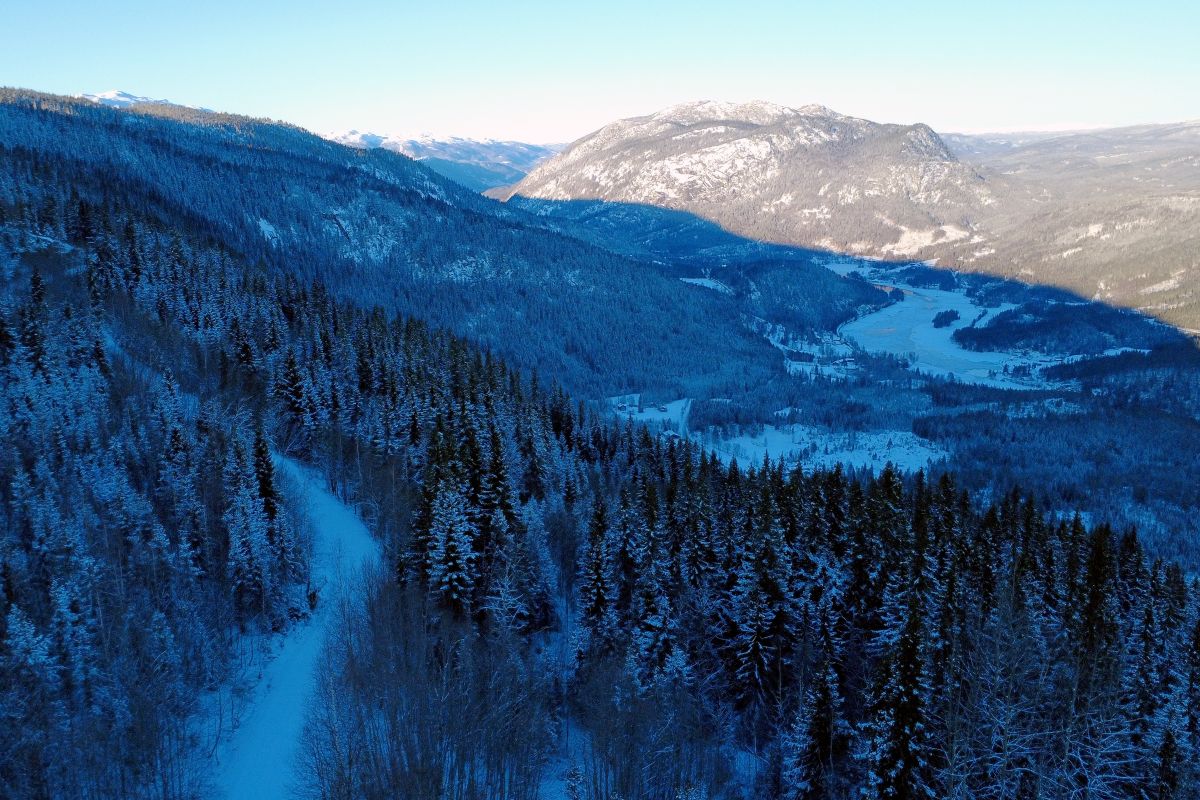 FRA BREKKEÅSEN: Dronebilde over skogen som er vernet nordvest for Veggli. I bakgrunnen ser vi Skagsåsen (973 moh.), som ligger helt sør i Nore og Uvdal kommune.