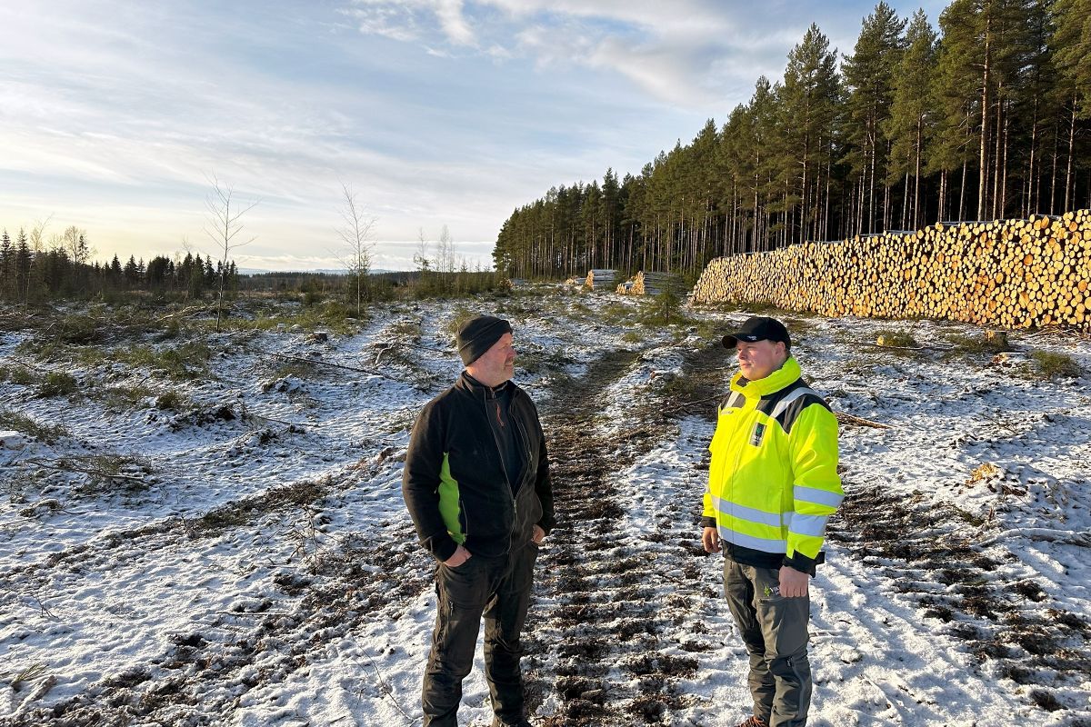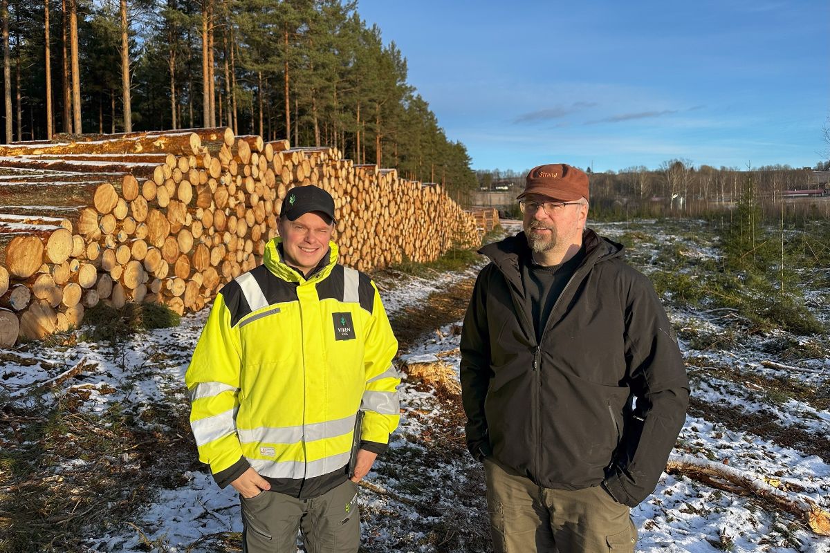 Skogeier Håkon Lindstad hadde bestilt hogsten, mens skogbruksleder Martin Tangen i Viken Skog kjøpte tømmeret.