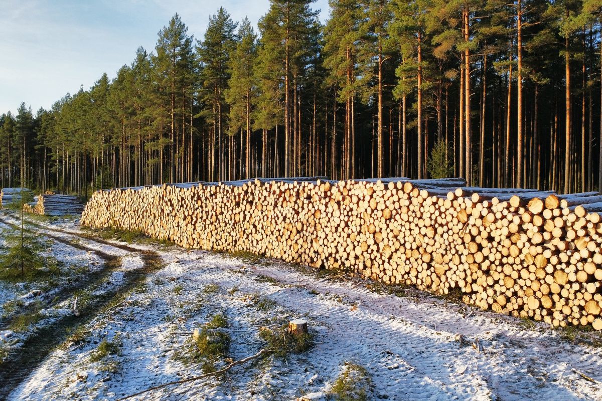 GULL I GRØNNE SKOGER: Solen lyste fint opp endene av tømmerstokkene i sagtømmervelten, et flott syn med den fine furuskogen i bakgrunnen.
