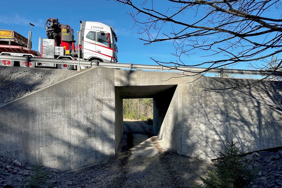 KULVERT UNDER E16: Passasjen er trang, men både hogstmaskinen og lassbæreren kommer gjennom.