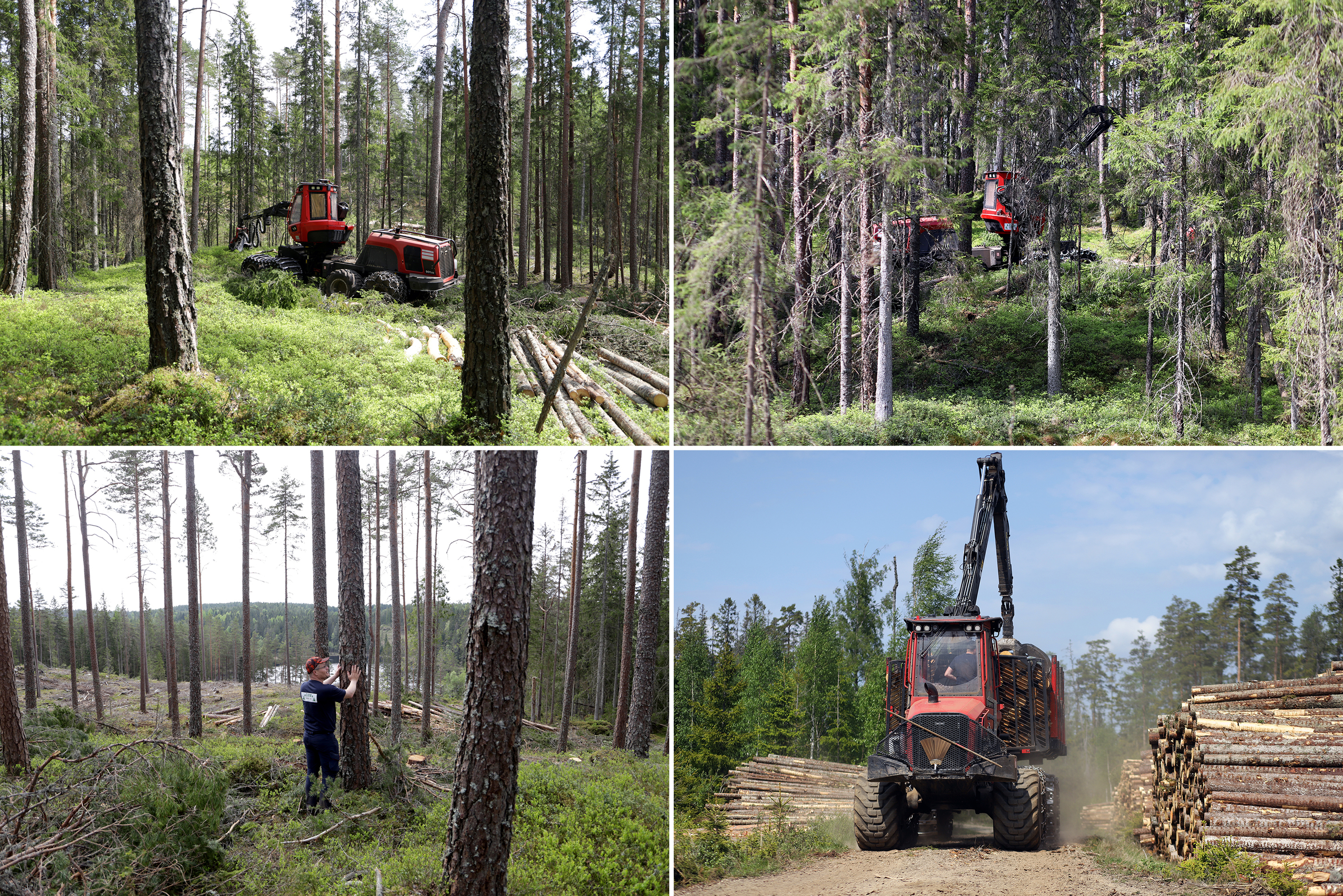 LITT MER TIDKREVENDE: Øverst: Hogstmaskinen fra ulike vinkler, til høyre sett fra der hogsten ennå ikke var ferdig. Nederst til venstre tar Claes et tre nærmere i øyesyn. Veltene Henrik Holmene Larsen bygget opp viste at det ble mye tømmer selv om mange trær skulle stå igjen i skogen.