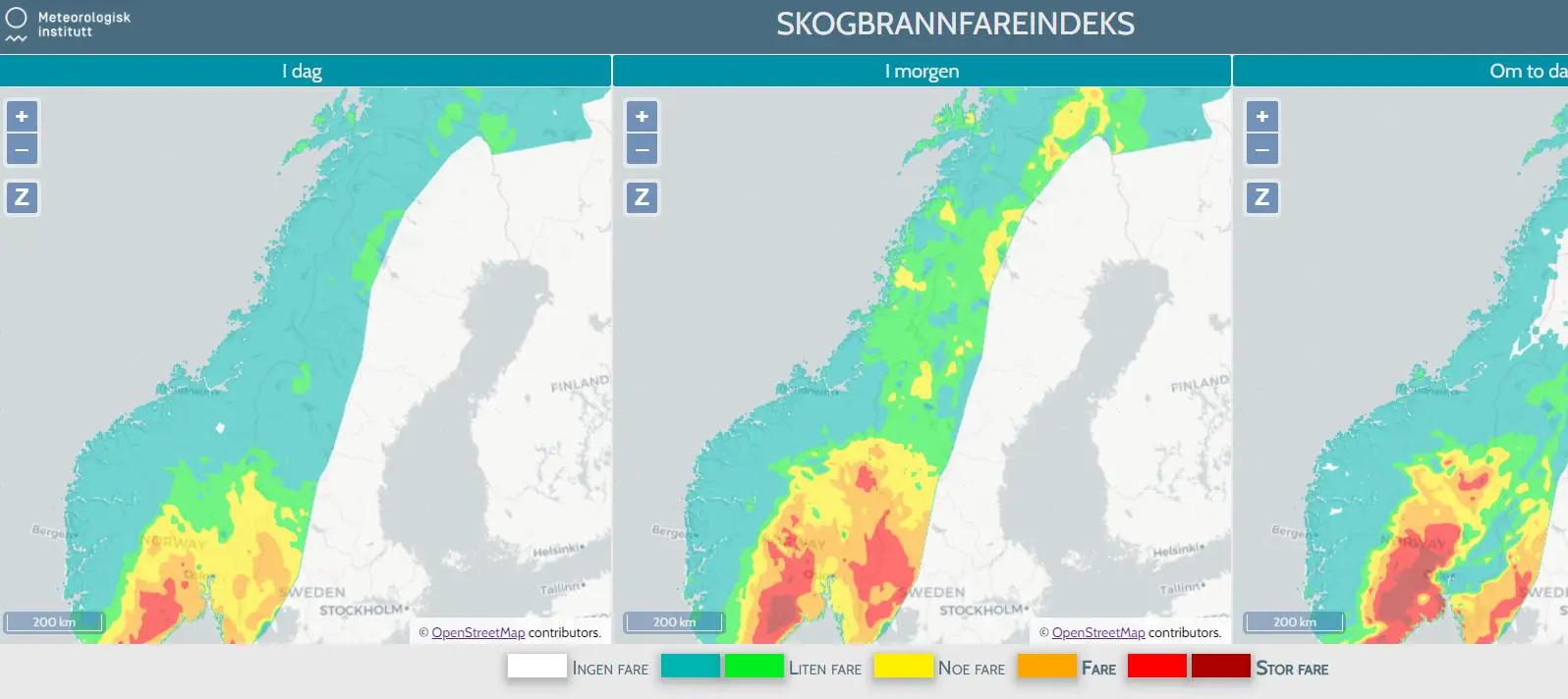 DE NESTE DAGENE BLIR DET RØDT OG MØRKERØDT FLERE STEDER: Se skogbrannfare.met.no