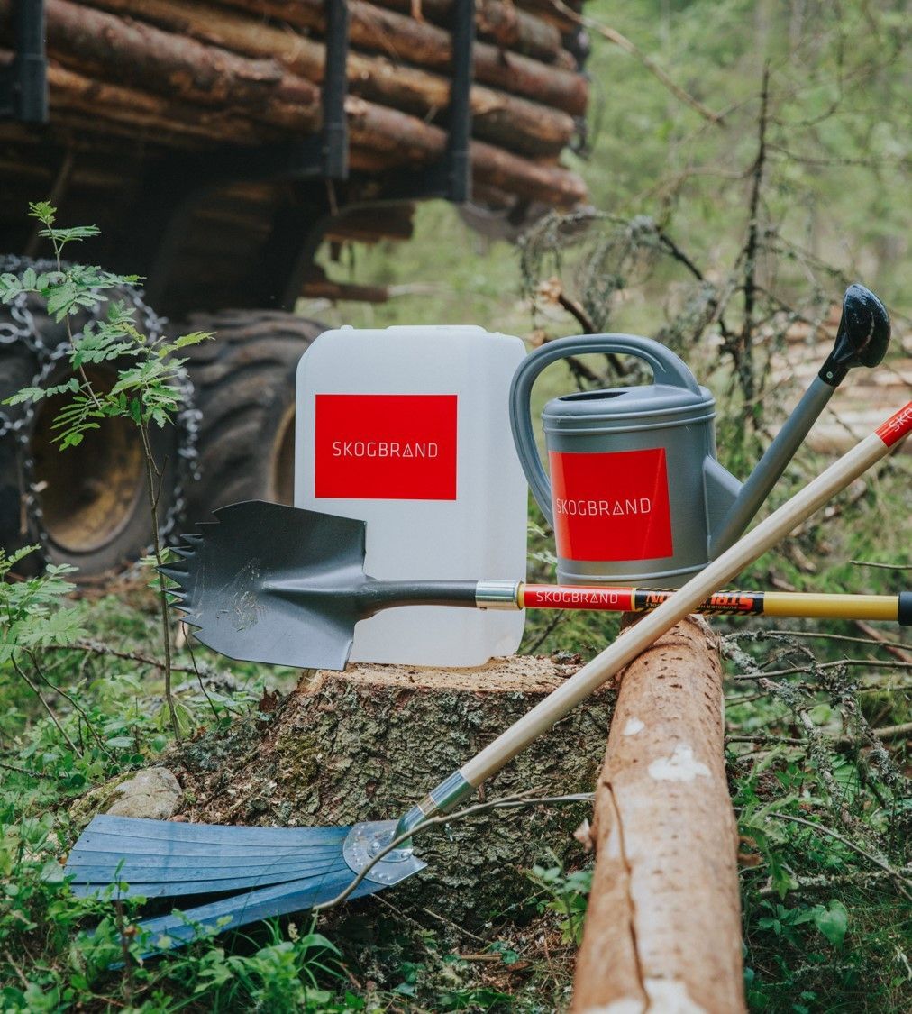 BEREDSKAPSPAKKE: Vanndunk, spredekanne, skogbrannstryker og spade.