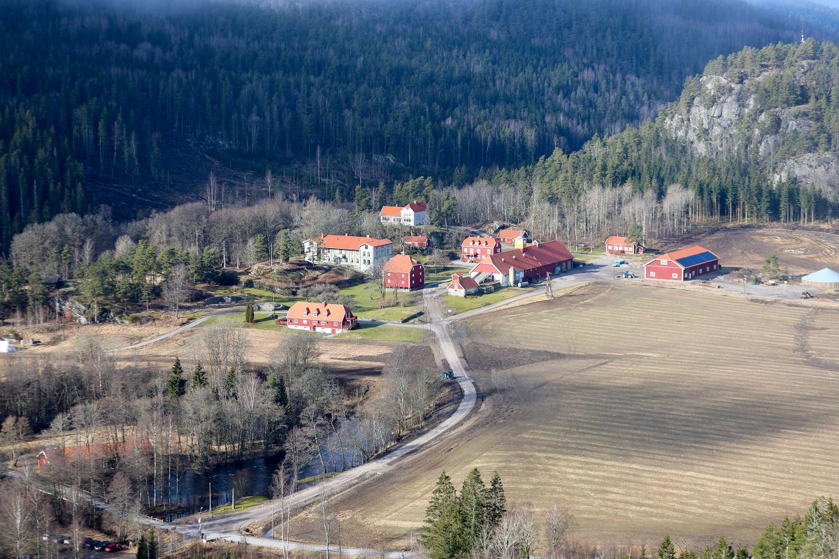 UTENDØRSAMFI: Det er god plass til utendørsteater nedenfor hovedbygningen og mot Berbyelva, men den har ikke vært brukt så ofte siden husmorskolen ble lagt ned – lenge før Jens Golden ble født. Sverige ligger bak åsen til høyre i bildet.