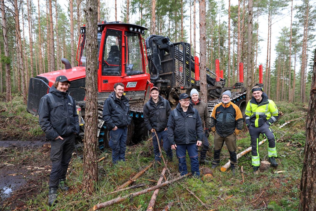 GSM SKOG: Fra venstre: Henrik Larsen (lassbærerfører), Kristian Snopestad (eier og skogsmaskinfører), Johan Magnusson (skogsmaskinfører), Claes Magnusson (eier og skogsmaskinfører), Jens Golden (eier og lassbærerfører), Morten Solberg (eier) og Oskar Kollegård (praksiselev).
