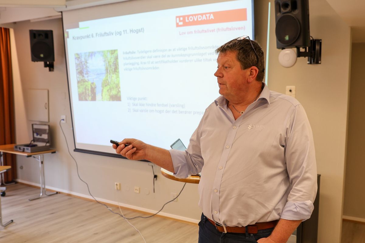 OM PEFC: Skogsjef Lars Kristen Haug tok blant annet opp punkter i markaforskriften og noen sentrale kravpunkter i PEFC-standarden.