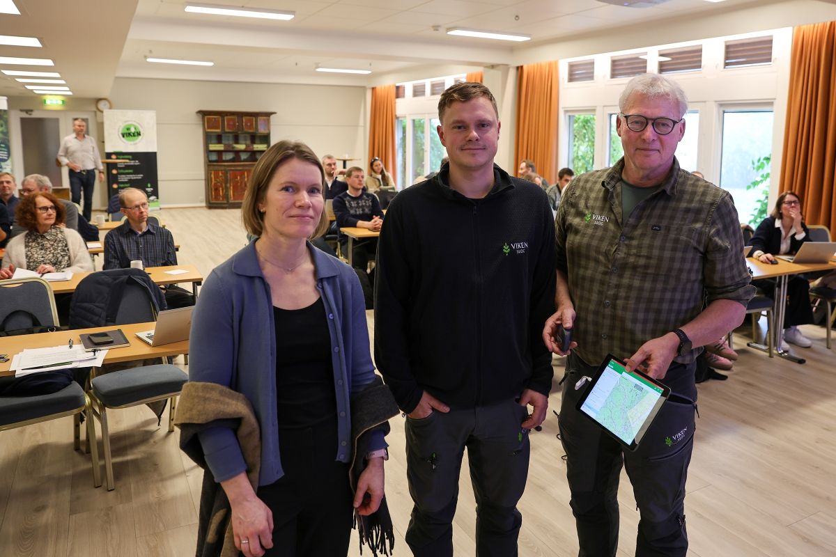 OM PLANLEGGING: Biolog Silje Waagaard, skogbruksleder Martin Tangen og opplærings- og utviklingsansvarlig Geir Jacobsen viste hvordan hogst planlegges og gjennomføres med gode, digitale verktøy i forbindelse med på møtet på Klækken hotell.