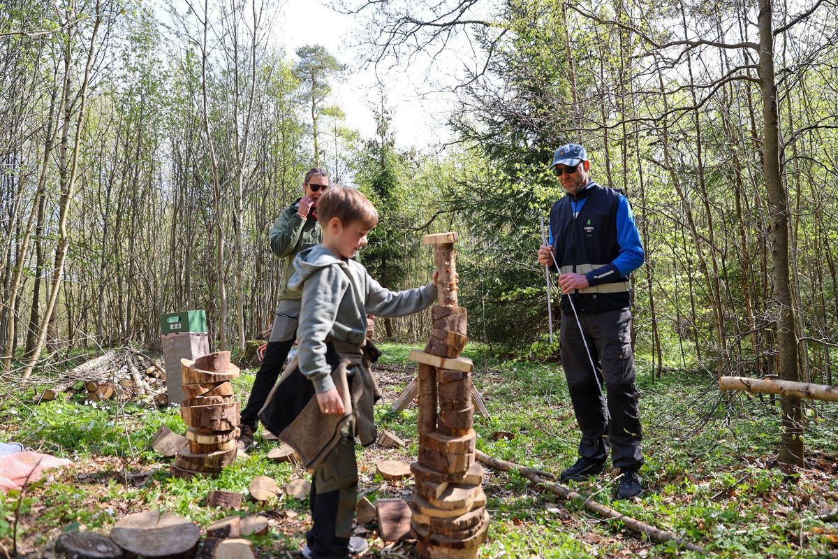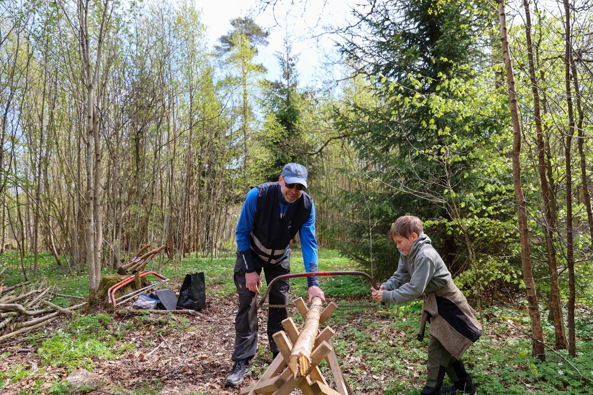 SKOGINTERESSERTE: Bjørnar Simonsen var blant dem som arrangerte årets første Ut i skauen. Her hjelper han Snorre Nygård med vedsagingen, en av aktivitetene for barna som deltok på skogdagen.